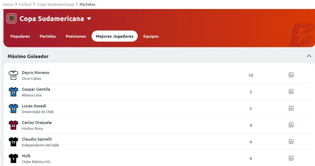 De la misma manera que el mercado de ganador del torneo, puedes apostar en Copa Sudamericana en el atractivo mercado de máximos goleadores. Las cuotas ofertadas por las operadoras suelen ser altas incluso en las actuales fases finales de la competición.