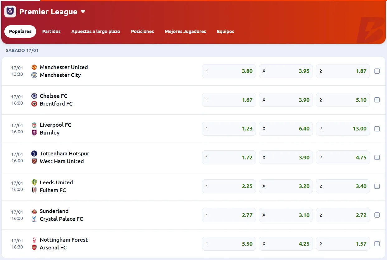 Esta es una de las apuestas Premier League con cuotas más altas. Es un mercado complicado de rentabilizar, pero si sabes detectar rachas y tendencias, puedes sacarle mucho provecho.