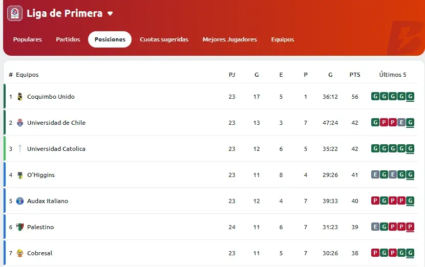 Los dirigidos por Esteban González son los claros favoritos y tienen una buena ventaja en la cima de la clasificación con 56 puntos. Asimismo, Universidad Católica no debe darse por muerto en el Campeonato Nacional 2025 con 42 unidades.