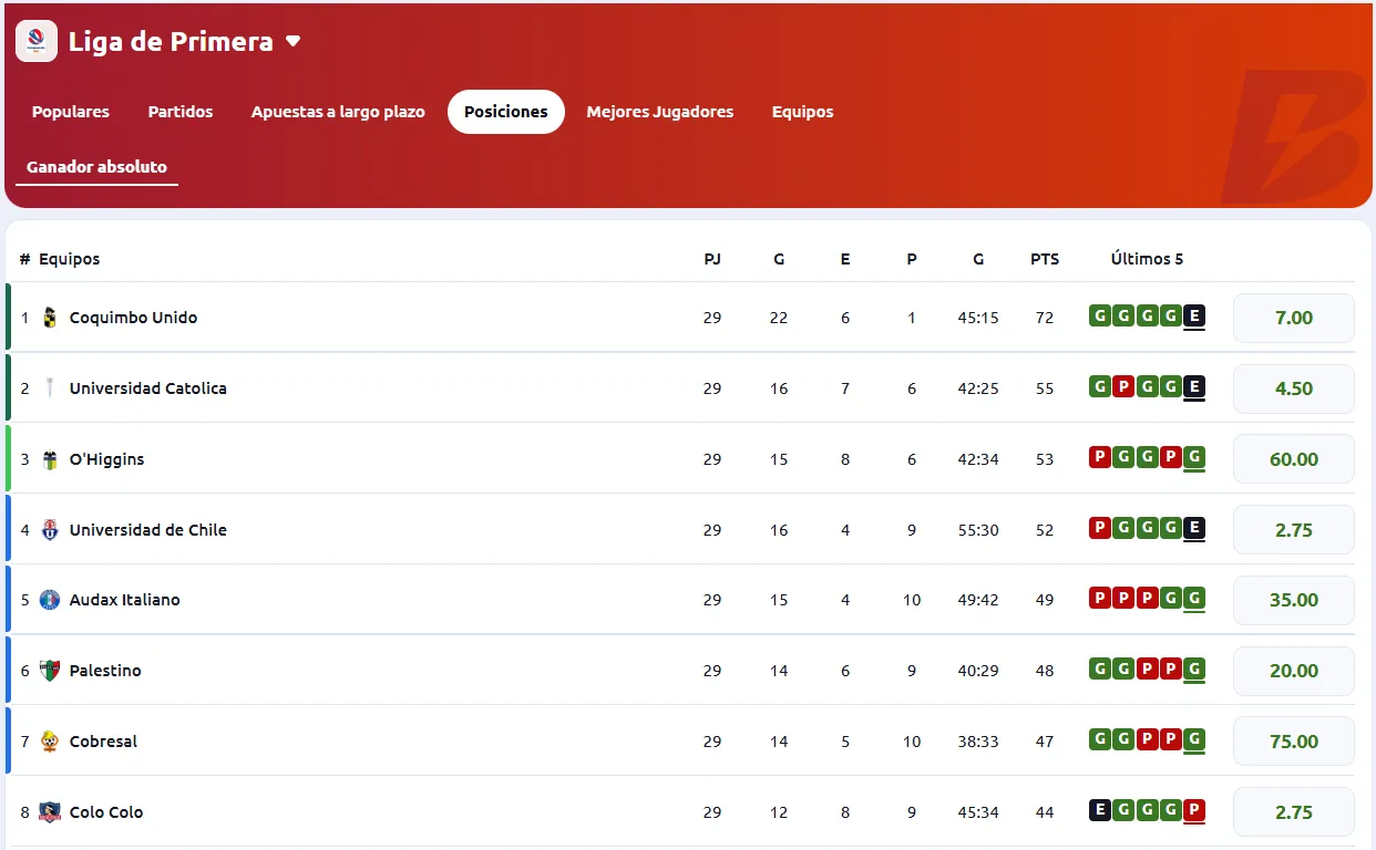 A continuación, te presentamos algunas de las apuestas más populares a las que puedes acceder en el Campeonato Nacional con Betano. También daremos luces de qué equipos son los favoritos para quedarse con el título de la Primera División en el Campeonato Nacional de Chile.