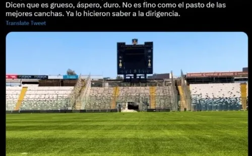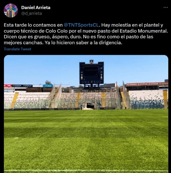 En primera instancia, el comunicador manifestó a través de su cuenta de Twitter que “hay molestia en el plantel y en el cuerpo técnico de Colo Colo por el nuevo pasto del Estadio Monumental”.