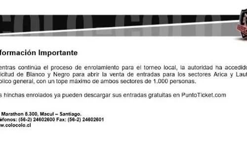 “Mientras continúa el proceso de enrolamiento para el torneo local, la autoridad ha accedido a la solicitud de Blanco y Negro para abrir la venta de entradas para los sectores Arica y Lautaroal público general, con un tope máximo de ambos sectores de mil personas”, aseguró el club mediante un comunicado.