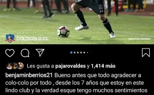 Berríos se despide del Cacique:“Bueno antes que todo agradecer a Colo Colo por todo. Desde los siete años estoy en este lindo club y la verdad es que tengo muchos sentimientos encontrados y mucho cariño hacía al club y su gente. Agradecer a todo aquel que fue parte de mi formación y estadía en el club, profesores, compañeros, las tías de la casa alba, del aseo y el casino, a los cancheros, psicólogos, kinesiólogosy un sin fin de buenas personas. Los recuerdo y estaré inmensamente agradecido por su buena disposición y el cariño que me demostraron día a día. Gracias Colo Colo”, escribeen Instagram.