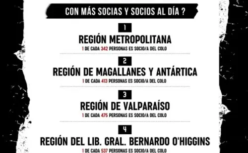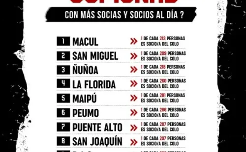 El CSD Colo Colo presentó en las diferentes plataformas de redes sociales una estadística sobre las regiones y comunas de Chile en las que hay más socios y socias del Cacique. Tanto la región Metroplitana como Macul figuran como los lugares donde hay más colocolinos comparándola con sus números de habitantes.