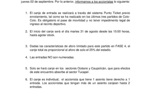 El proceso para canjear las entradas comenzará este martes 31 de agosto a partir de las 15:00 horas y será hasta agotar stock. Al estar la comuna de Macul en fase 4 por el plan Paso a Paso para prevenir el Covid-19 el aforo del estadio será del 25 por ciento, por lo mismo, el canje de entrada será solo para los sectores de Océano y Caupolicán.