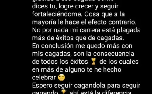 “Gracias a esa cagada como dices tú, logre crecer y seguir fortaleciéndome. Cosa que a la mayoría le hace el efecto contrario. No por nada mi carrera está plagada más de éxitos que de cagadas”, escribió el bicampeón de América.