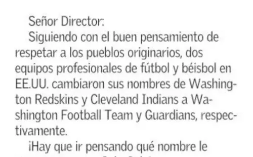 En Estados Unidos el llamarse “Indios” o “Pieles Rojas” resultaba tremendamente ofensivo para un porcentaje importante de la comunidad, por lo que ambas franquicias optaron por cambiarse de nombre, pasando el equipo de la MLB a llamarse Guardians a partir de la próxima temporada y el de la NFL como Washington Football Team.