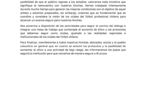 Nos ponemos a disposición de las autoridades para seguir el camino del diálogo e integrar una mesa de trabajo que contemple el aumento de aforo y los protocolos que debemos seguir como clubes, ajustado a las realidades regionales e institucionales de los clubes del fútbol chileno.