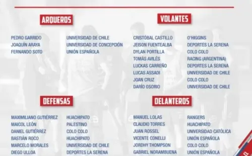 Además, los otros albos que dirán presente serán el defensor Daniel Gutiérrez, el mediocampista Dylan Portilla y el delantero Jordhy Thompson. Los dos últimos, fueron titulares en la goleada de la Roja ante la selección de Tocopilla del pasado miércoles.