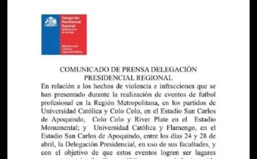 Mediante un comunicado, la Delegación Presidencial de la Región Metropolitana señaló que “en uso de sus facultades, y con el objetivo de que estos eventos logren ser lugares seguros para las familias y público en general, ha instruido procedimientos sancionatorios en contra de los organizadores de dichos eventos, en los que se han visto involucrados los equipos de fútbol Universidad Católica Y Colo Colo”, agregando los lamentables hechos que también ocurrieron en San Carlos de Apoquindo.