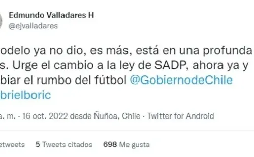 “El modelo ya no dio, es más, está en una profunda crisis. Urge el cambio a la ley de SADP, ahora ya y cambiar el rumbo del fútbol”, arrobando a las cuentas del Gobierno de Chile y del presidente de la República.