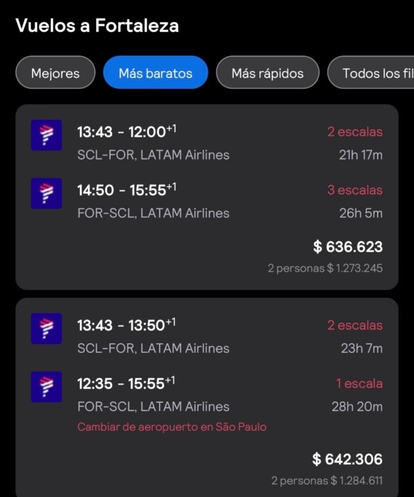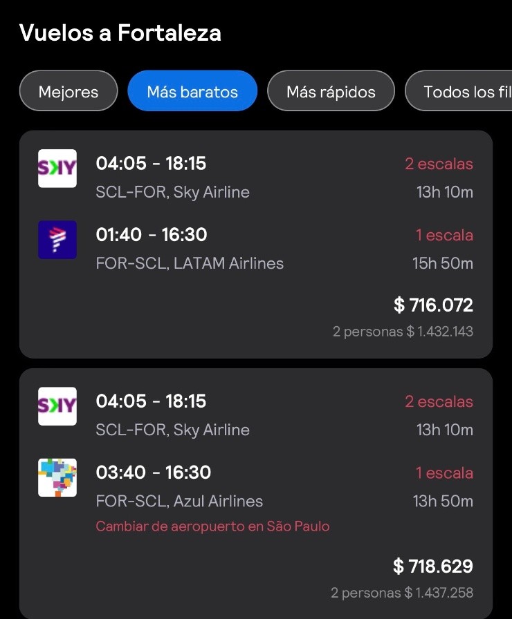 Ahora vamos a lo que nos convoca, ¿cuánto sale viajar a Fortaleza a dos semana del partido? Para esta simulación ocupamos la aplicación Skyscanner que hace un filtro con los vuelos más baratos.