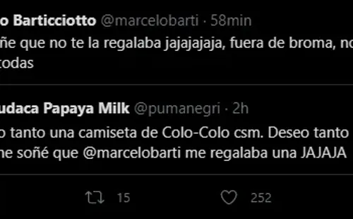 “Deseo tanto una camiseta de Colo Colo. Deseo tanto una que anoche soñé que @marcelobarti me regalaba una”, señaló. El tweet llegó hasta los ojos de Barticciotto, quien le dejó un simpático trolleo.