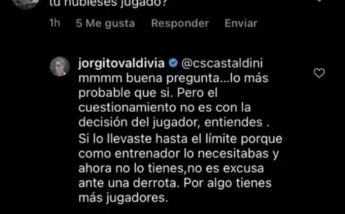 El hincha le respondió y comentó que “no cuestiono tu comentario, solo quería saber la posición del jugador con las responsabilidades que todo esto pueda traer, independiente de las excusas”. Y Valdivia cerró con un “es que el fútbol es eso. Genera debates. Cada uno tiene su verdad”.