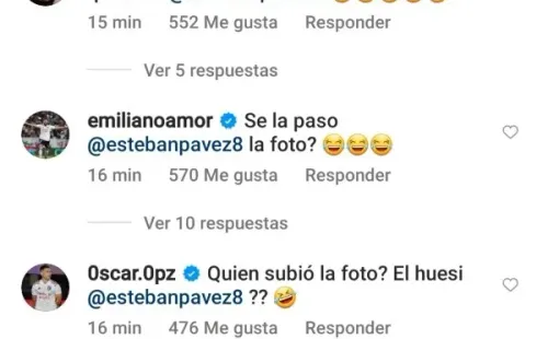 “El CM ya sabemos quién es”, expresó Gabriel Suazo, etiquetando a Pavez; “¿Se la pasó Esteban Pavez la foto?”, comentó Emiliano Amor; “¿Quién subió la foto? El Huesi”, señaló Óscar Opazo, desatando las risas y comentarios de los hinchas.