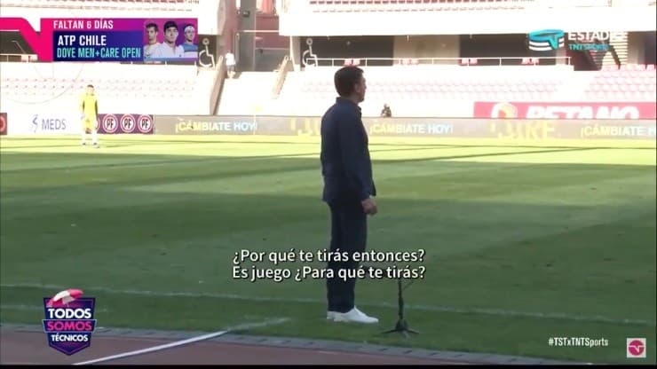 Al ser un partido sin público, las cámaras de TNT Sports captaron un tirón de orejas de Gustavo Quinteros a Maximiliano Falcón, quien se ganó una tarjeta amarilla en el primer tiempo.