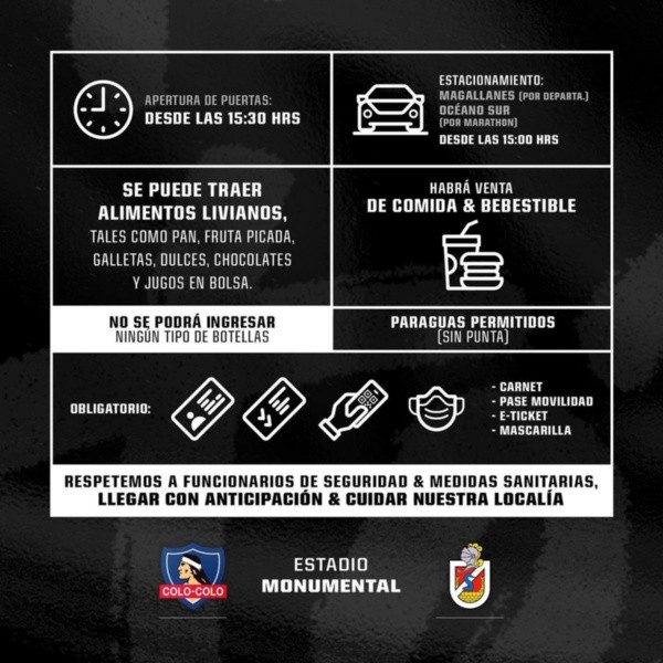 Las puertas del Estadio Monumental se abrirán a las 15:30 horas, dos horas antes de que inicie el compromiso ante Deportes La Serena. Existe un aforo máximo de 10 mil personas para que puedan presenciar el partido, producto de las medidas relacionadas al Covid 19.