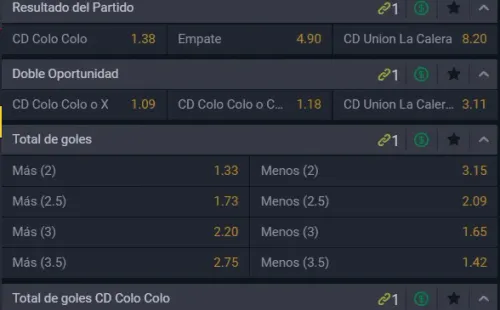 Para Betsala, el gran favorito para ganar este partido de la fecha 8 del Campeonato Nacional es Colo Colo, que paga 1.38 veces lo que juegues, por sobre los 8.20 que paga Unión La Calera, si crees que los cementeros se quedan con el partido. Ahora, el empate paga 4.90 veces lo que apuestes en la Sala de los Campeones.