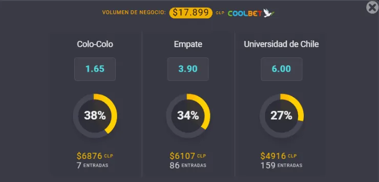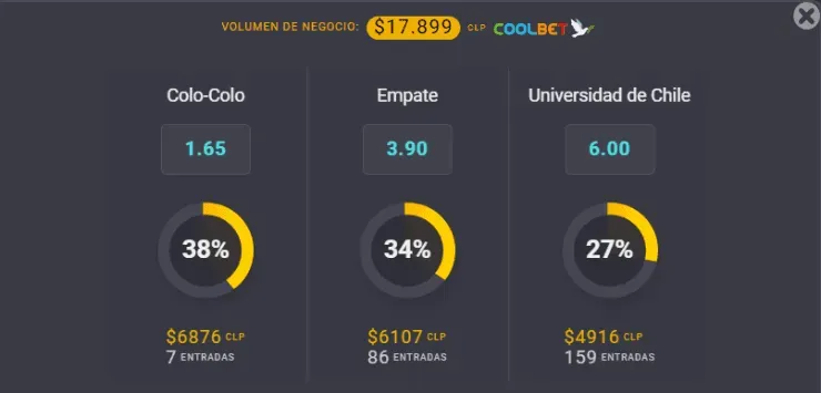 Para el OSO de Coolbet, el gran favorito para ganar en el Superclásico del fútbol chileno es Colo Colo, que paga 1.65 veces lo que juegues, por sobre los 6.00 que paga Universidad de Chile. Ahora, el empate entre ambos para 3.90 veces lo que apuestes, conociendo el resto de cuotas disponibles para este encuentro de la quinta fecha del Campeonato Nacional 2022.