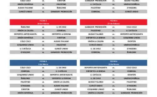 Los albos comenzarán su camino recibiendo a Everton, aunque destaca que deberá jugar el Superclásico contra Universidad de Chile muy pronto. El duelo está programado para la quinta fechade la primera rueda yse disputará en el estadio Monumental el fin de semana del 6 de marzo, donde quieren extender a 22 añossu invicto como local ante el archirrival.