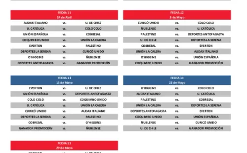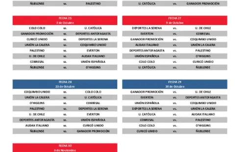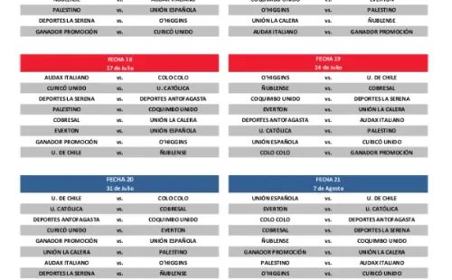 La segunda mitad del Campeonato Nacional comenzará el fin de semana del 3 de julio. Los parates serán en agosto, otro por Fiestas Patrias, otro en octubre y el cierre del certamen será el domingo 6 de noviembre, pensando que este año se disputará el Mundial en una fecha diferente: entre el 21 de noviembre al 18 de diciembre.