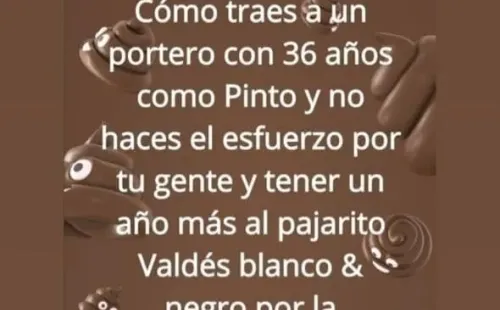 No se sabe si esos mensajes son concretos al movimiento en el mercado del Cacique, pero en Instagram compartió una publicación explicita de un hincha disgustado por la contratación del arquero Miguel Pinto. El mensaje contenía emojis de caca.
