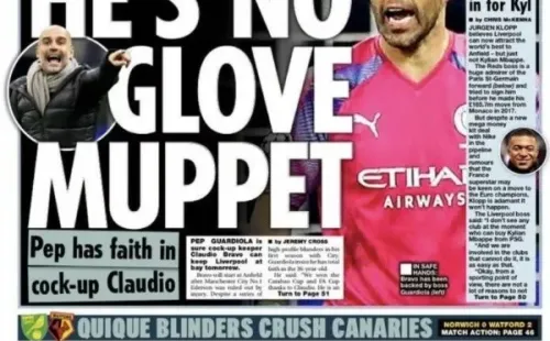 “Pep Guardiola está seguro de que el arquero problema Claudio Bravo puede mantener a Liverpool a raya (…). Después de una serie de errores en sus primeras temporadas, Guardiola insiste que tiene total fe en el jugador de 36 años”, sentenció el tabloide.