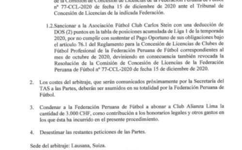 La resolución implica, además, que los costos del arbitraje deberán ser asumidos por la federación peruana, quien deberá abonar tres mil francos suizos ($ 2.365.000) a las cuentas del club limeño “como contribución a los honorarios legales y otros gastos en los que esta ha incurrido en el presente procedimiento”, indica el dictamen.