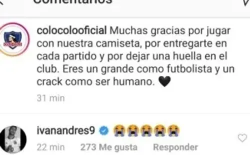 Uno de ellos fue Iván Morales, quién respondió con una delágrimas a una publicación de Colo Colo despidiendo al Pajarito y también le publicó un sentido mensaje en su cuenta de Instagram personal.
