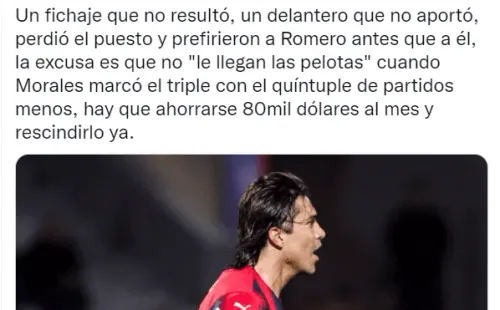 “Un fichaje que no resultó, un delantero que no aportó, perdió el puesto y prefirieron a Romero antes que a él, la excusa es que no “le llegan las pelotas” cuando Morales marcó el triple con el quíntuple de partidos menos, hay que ahorrarse 80 mil dólares al mes y rescindirlo ya”, escribieron. ¿Se salvó Colo Colo?