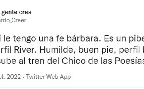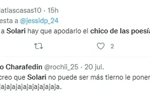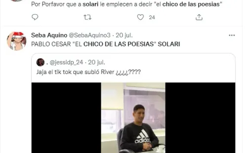 Resulta que en redes sociales Solari recibió el alias de “El chico de las poesías”, esto apropósito de un video de Tik Tok publicado por la cuenta oficial de River Plate, donde presentaba a sus refuerzos en esta ventana de mercado de pases, entre ellos el ex Colo Colo, al ritmo de la canción “Bella y sensual” de Romeo Santos.
