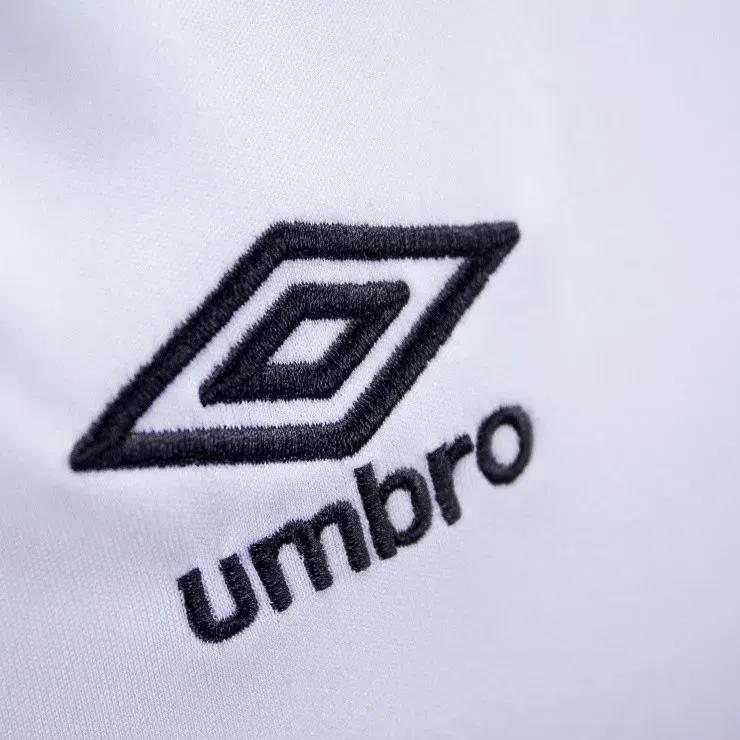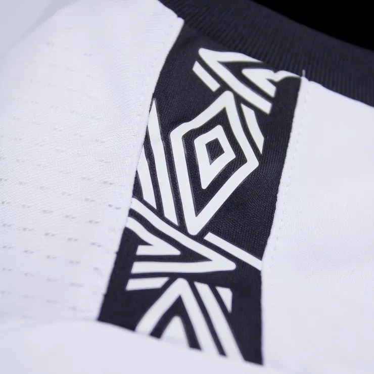 La tricota es sobria, blanca completa con detalles negros, insignia bordada y aplicados que juegan con la insignia de Umbro.