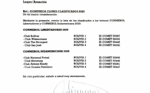 Sin embargo desde la FBF disiparon todas las dudas y a través de una carta confirmaron a sus representantes en las copas, donde se ratifica al Wilstermann como el segundo clasificado.