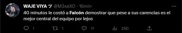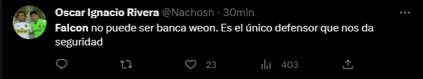 Por lo mismo, tras el gol convertido, los más asiduos a las redes sociales se volcaron a Twitter para reaccionar a lo ocurrido y a seguir insistiendo en que Falcón no puede salir más del equipo titular de Gustavo Quinteros.