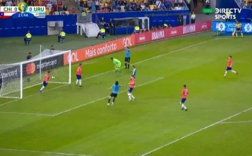 Arias logró recuperar la posición y achicó de buena forma enviando el balón al corner. Hasta ahí todo normal, pero Suárez algo fuera de contexto pidió mano del arquero chileno. El uruguayo hizo el gesto con su brazo y el árbitro Raphael Claus ni lo miró.