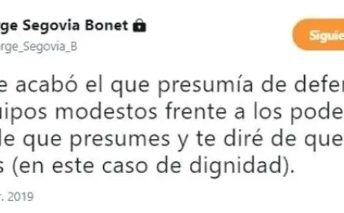 Ahora aprovechó de hacer su aparición en redes sociales para criticar la llegada del ex presidente de la ANFP a Colo Colo:“¿Donde acabó el que presumía de defender a los equipos modestos frente a los poderosos? Dime de que presumes y te diré de que careces (en este caso de dignidad)”.