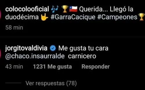 Valdivia dio like a la foto del campeonato que subió el Popular en sus redes y aprovechó el momento para trollear a su amigo Juan Manuel Insaurralde: “Me gusta tu cara, carnicero”, escribió el Mago.