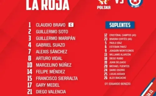 La formación es la siguiente: Claudio Bravo; Guillermo Soto, Guillermo Maripán, Francisco Sierralta, Gabriel Suazo; Gary Medel, Felipe Méndez; Arturo Vidal, Marcelino Núñez; Alexis Sánchez y Diego Valencia. En la banca están los colocolinos Esteban Pavez y Brayan Cortés.