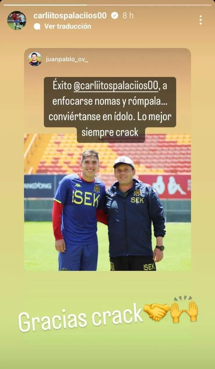 “Exíto Carlos Palacios, a enfocarse no más y rómpala. Conviertase en ídolo. Lo mejor siempre crack”, escribió el ayudante técnico de Unión Española. Ante esto la historia fue reposteada con un “gracias crack”.