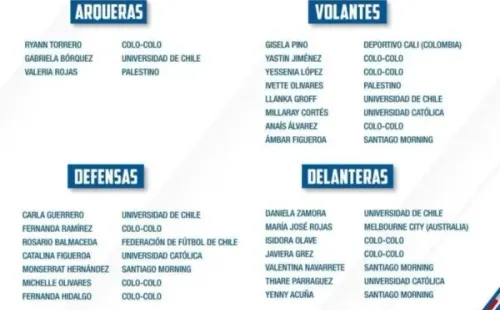 En la nómina destacan las colocolinas: Ryann Torrero, nueva portera del Cacique, las defensoras, FernandaRamírez, Michelle Olivares y Fernanda Hidalgo, las mediocampistas, Yastin Jiménez, Yessenia López y Anaís Álvarez y las atacantes, Isidora Olave y Javiera Grez.