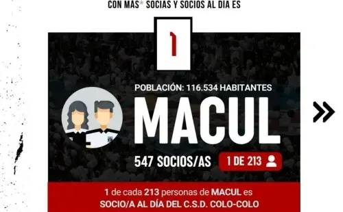 Según lo publicado, la comuna con más colocolinosen relación con los habitantes es Macul, donde actualmente existen 547socios al día, lo que equivale a que 1 de cada 213 personas de dicha comuna sonsocios del CSD Colo Colo. A esto, se suma que es la región Metropolitana, la que cuenta con más hinchas inscritos en el ClubSocial y Deportivo con 19.656, lo que se traduce en que1 de cada 362 personas son colocolinas en la capital.