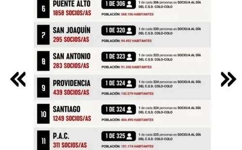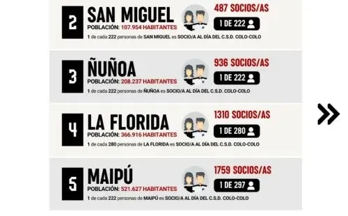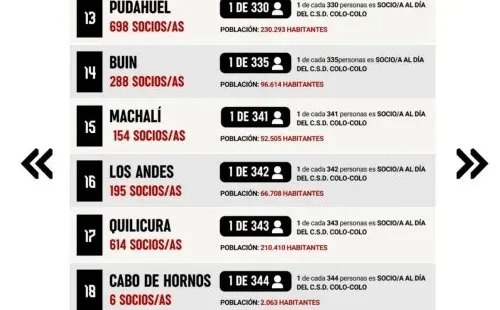 En las plataformas sociales del CSD Colo Colo se publicó durante la jornada una estadística, en la cual se buscaba saber cuál era la comuna más colocolina. De esta forma, fue el propio club, que elaboró un ranking tanto de las comunas como con las diferentes regiones del país, que cuentan con más socios al día.