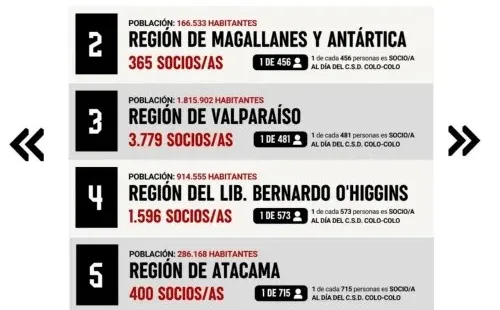 Además de la capital, las cinco primeras regiones con más colocolinas la completan, la región de Magallanes y Aysén con 365 socios (1 de cada 456), región de Valparaíso 3.779 (1 de cada 481), región del Libertador Bernardo O’Higgins 1.596 (1 de cada 573) y región de Atacama, que cuenta con 400 socios (1 de cada 715).