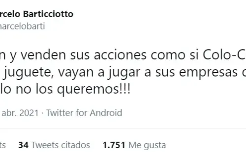 “Compran y venden sus acciones como si Colo Colo fuera un juguete, vayan a jugar a sus empresas que en Colo-Colo no los queremos”, expresó el Siete del Pueblo a través de su cuenta de Twitter. Publicación que de inmediato generó cientos de reacciones.