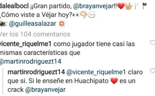 El ex atacante albo utilizó el Instagram de DaleAlbo para responder el comentario de un seguidor, quien lo comparó con el puntero izquierdo, afirmando que “como jugador tiene casi las mismas características que Martín Rodríguez”, a lo que Rodríguez respondió con humor “claro que si, si le enseñé en Huachipato. Es un crack”.