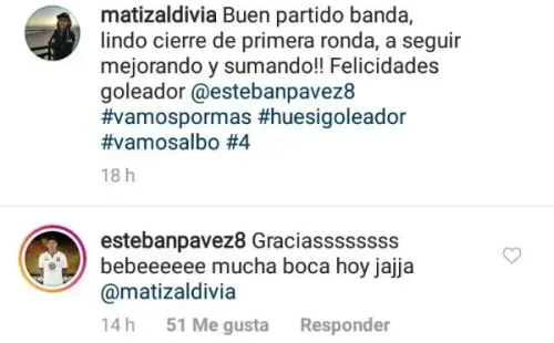 Pavez le contestó en tono de humor: “Gracias bebé, mucha boca hoy”.El ambiente del Cacique es de los mejores justo cuando terminó la primera rueda y se viene el debut por Copa Chile ante Puerto Montt el domingo 9 de junior a las 15:00 en el Estadio Chinquihue.