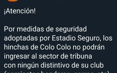 Cobresal hizo el llamado en la semana a los hinchas del Cacique a no asistir con prendas identificadoras al sector por política interna.Estadio Seguro rechazó la medida y el club borró la publicación, pero igual insistió en prohibir las camisetas.