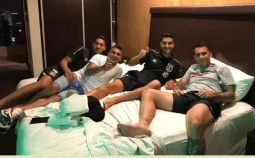 En la imagen también aparecen Juan Manuel Insaurralde y Pablo Mouche “recordando viejos tiempos” en una de las piezas del hotel de concentración. Todos ellos compartieron camarín en Boca Juniors y por su cercanía de edad se hicieron buenos amigos.