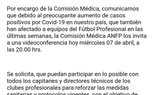 Ante esta en la ANFP están tomando manos en el asunto para que la actividad se pueda seguir desarrollando en esta temporada 2021, esto gracias al fortalecimiento de los protocolos sanitarios que puedan mantener en mínimo los focos infecciosos en los equipos de fútbol.