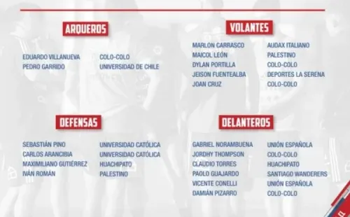 En el listado entregado por el estratega de la Roja, nuevamente Colo Colo es el equipo que más futbolistas aporta con cinco nominaciones, lo que refleja el buen trabajo que se ha venido realizando en el Fútbol Joven.